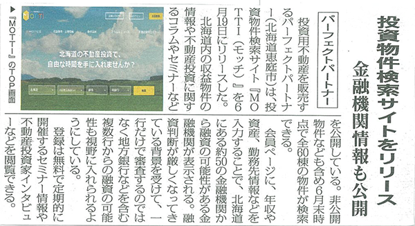 弊社が運用している不動産投資マッチングサイト『MOTTI』のグランドオープン記事が、週刊全国賃貸住宅新聞(2018年7月30日付)に掲載されました。